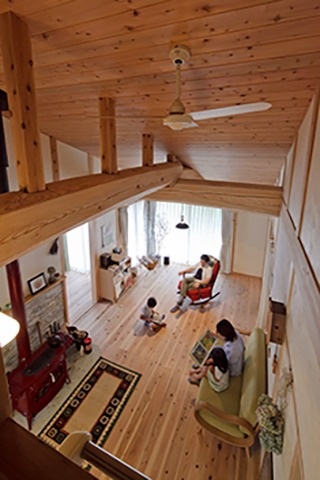 中)昔から生活の中で木に触れる機会が多かったというご主人らしく、リビングの天井には圧倒的なボリュームのある丸太を配した。床材は厚みのある杉で、木の質感をしっかり出すと同時に断熱性能をアップ。
