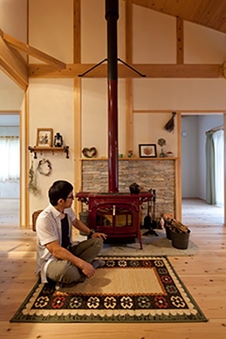 左)「薪ストーブは炎の劇場だ!」リビングにはあえてテレビを置かない。薪ストーブが主役なのだ。メラメラと燃えて様々な形を創りだす炎を眺めるだけで、不思議と心が落ち着くという。