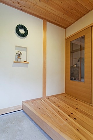 右)玄関のたたきはご主人がこれから作りこんでいく部分。ここのニッチには娘と同じ名前の梓の木を使用。奥さんがオイルフィニッシュして仕上げたものだそう。
