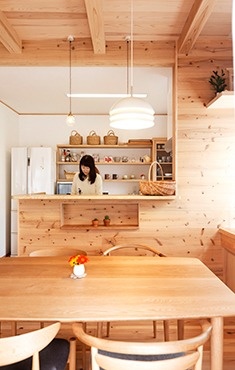 建具や食器棚は高山の家具職人であるご主人のお父様の手づくりで、壁の珪藻土は家族や友人、当社スタッフみんなで一生懸命に塗ったもの。