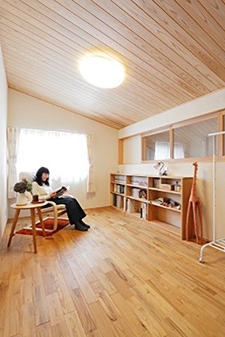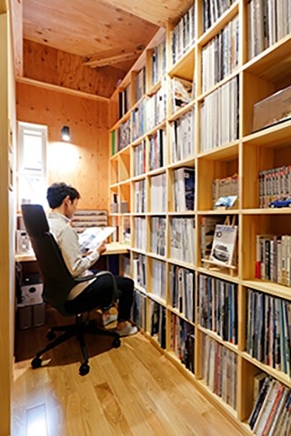右)機能性に富む2.6帖の書斎。壁に作りつけられた収納棚は納めるものの大きさに合わせて造作。ご主人の趣味の本などがキレイに収まり、探しやすく、戻しやすい。そのせいか、狭さが苦にならず、むしろ狭さにワクワクさせられる空間となっている。小窓もポイント。