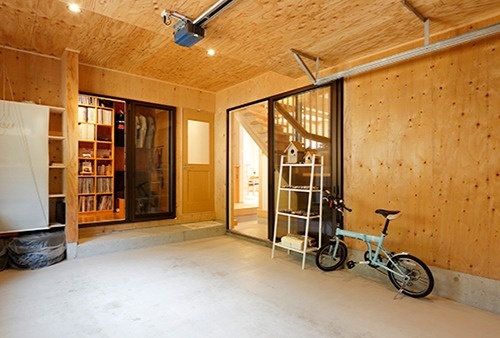 左)薪ストーブの薪の保管場所として、またDIYの作業場として重宝している広い土間の倉庫。あえてガラス戸を設置し、LDKとつながっている感じを出したところがユニーク。書斎からも出入りできる。室内と室外があいまいで面白い。
