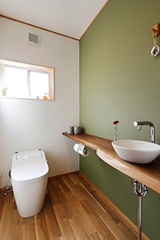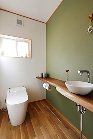 左)トイレには落ち着いた雰囲気を醸す壁紙を選択。カウンターに上質な厚めの一枚板を持ってくるのは贅沢に感じるがそれも粋だ。