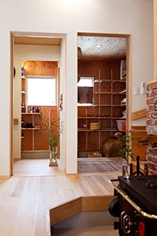 中)玄関横のシューズクローク付の土間はパントリーともつながっている。泥付きの野菜もゴロンと置ける。