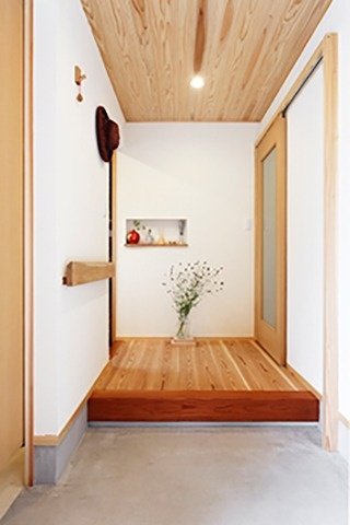 右)玄関には節目のない木材のみを使用し、美しく洗練された印象に。白い塗り壁とニッチも調和している。