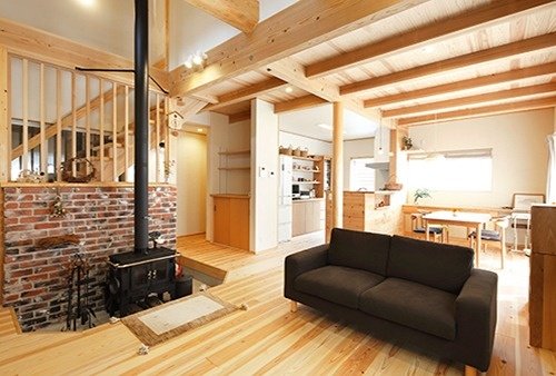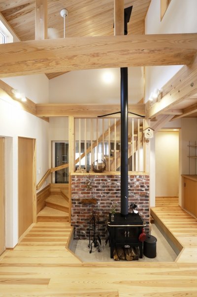 左)天井も床も、木をふんだんに使用したLDK。薪ストーブの煙突と丸い大黒柱の相似が美しい。木目中心のフロアの中でヴィンテージ風のレンガがアクセントになっている。