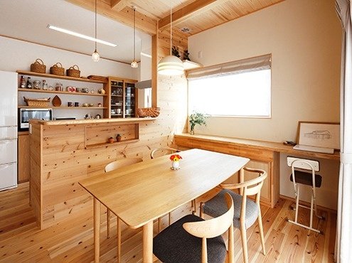 左)絶妙な位置、大きさで備え付けられた窓から、ダイニングにやさしい光が差し込む。デスクコーナーも便利。
