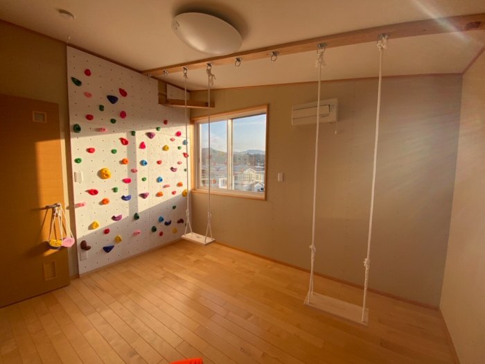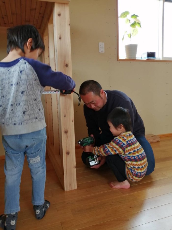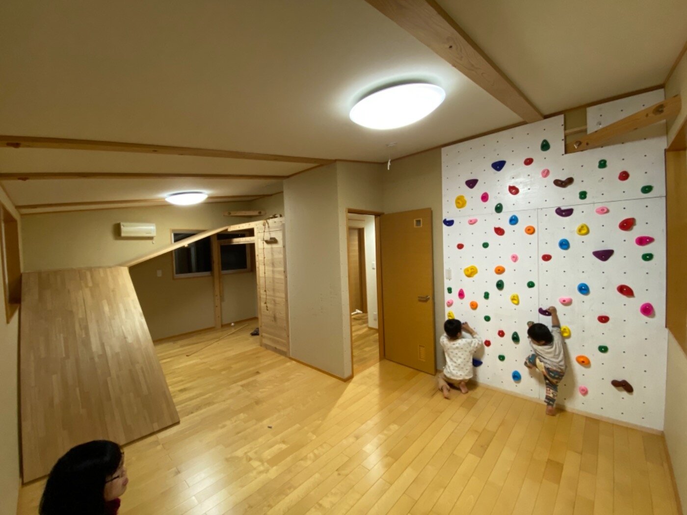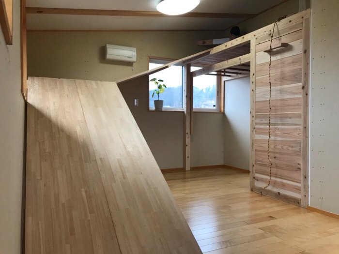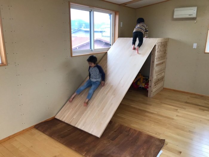 建築した当時は1歳の息子が一人だったので車のオモチャで走り回れるスペースとしていたのですが、子供も増え、物足りなくなり、勾配天井で天井に余裕があったので、滑り台を作ろう!と設計図という名のラクガキを書き。形となったのは昨年の3月。まさにコロナ真っ只中でしたね。