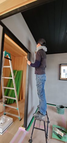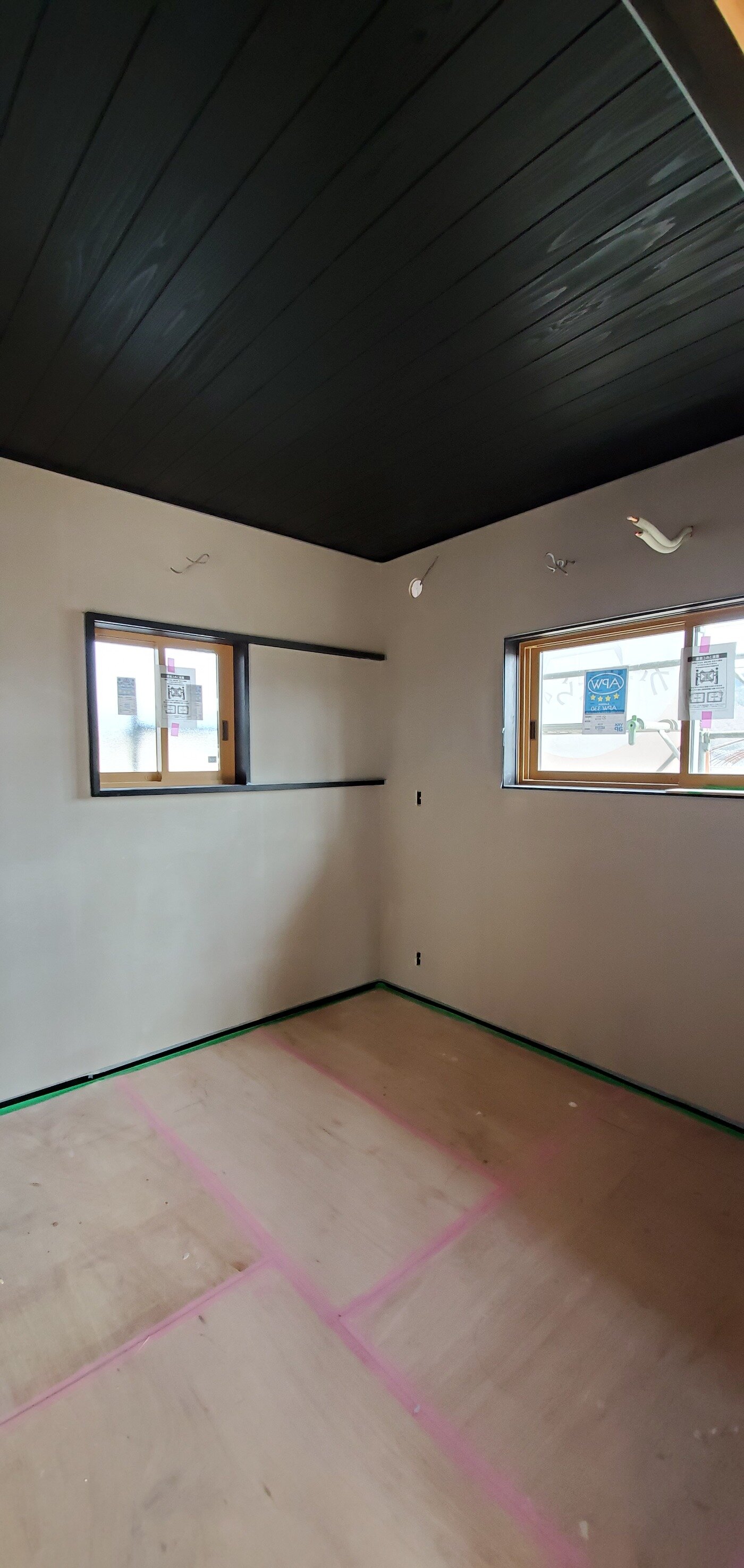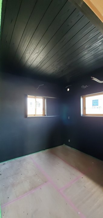 床も養生で隠れていますが、真っ黒に塗装してある杉板で仕上げていますので、あとは、窓の所にこれもまた黒い板戸を取り付けて、真っ黒な部屋の完成です!