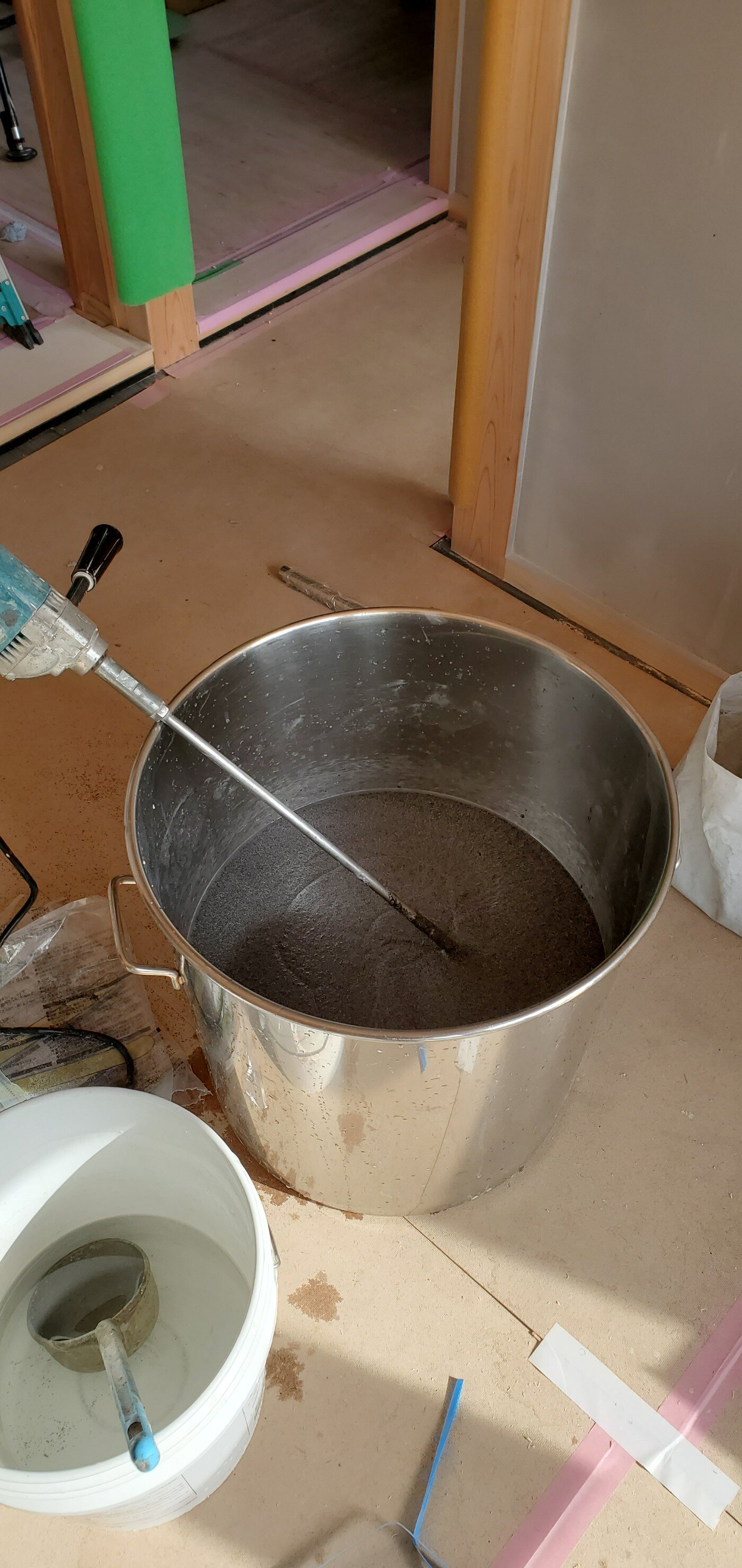 下塗り作業はすでに終わっており、昨日から、左官屋さんによる仕上げ塗り作業が始まりました。
