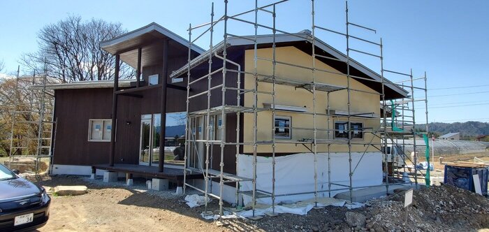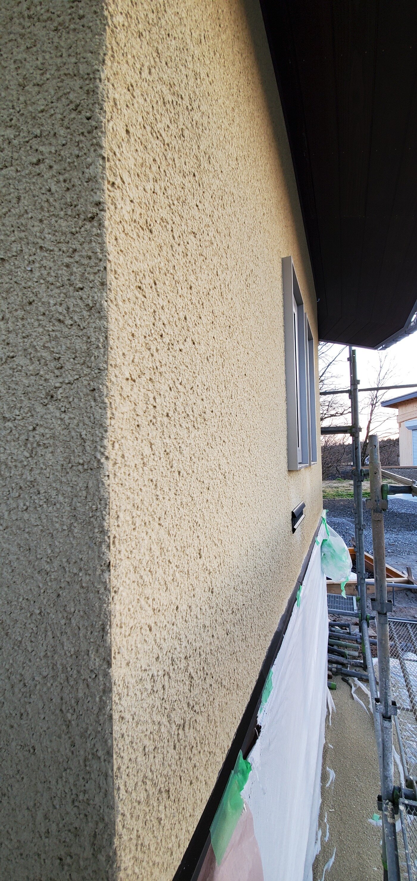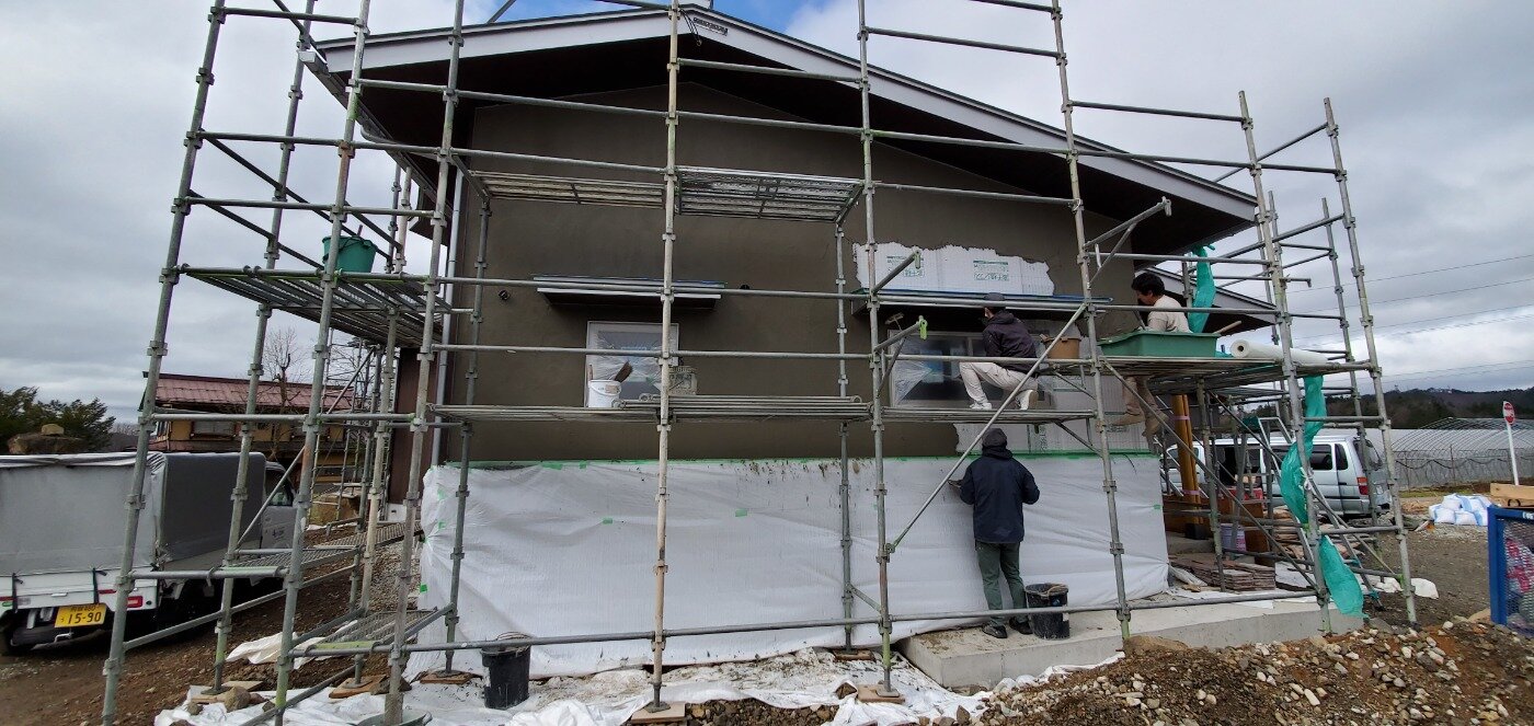 いよいよ完成間近となってきて、気温の関係などで外壁の塗り壁が出来ないままでしたが、気温も暖かくなり、満を持して外壁塗り壁工事を行いました。