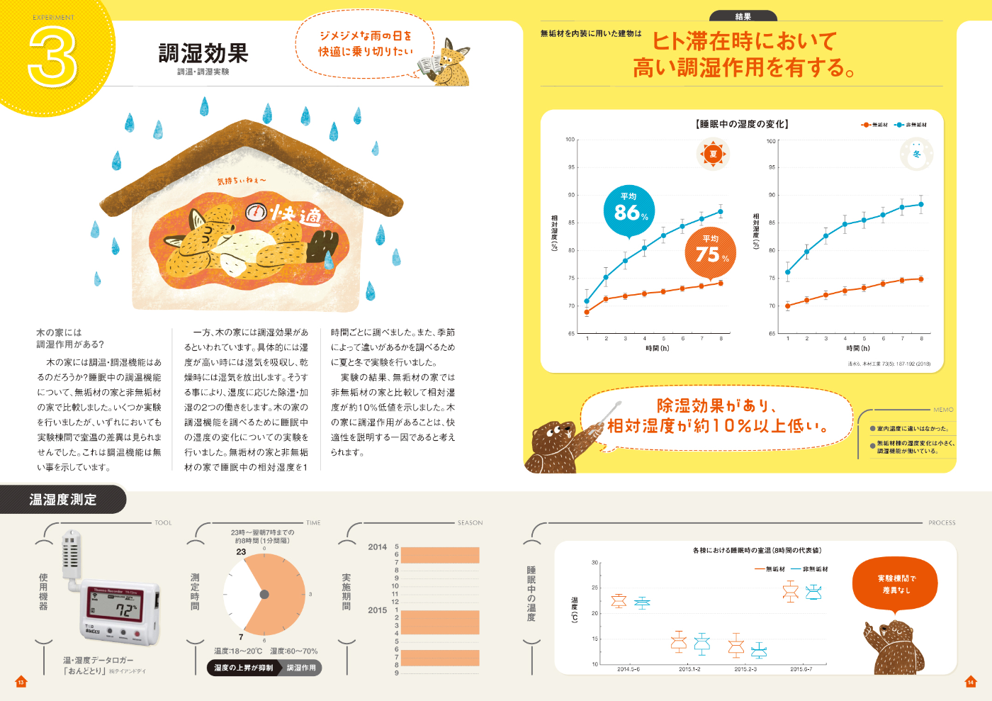 そうする事により、湿度に応じた除湿・加湿の2つの働きをします。木の家の調湿機能を調べるために睡眠中の湿度の変化についての実験を行いました。