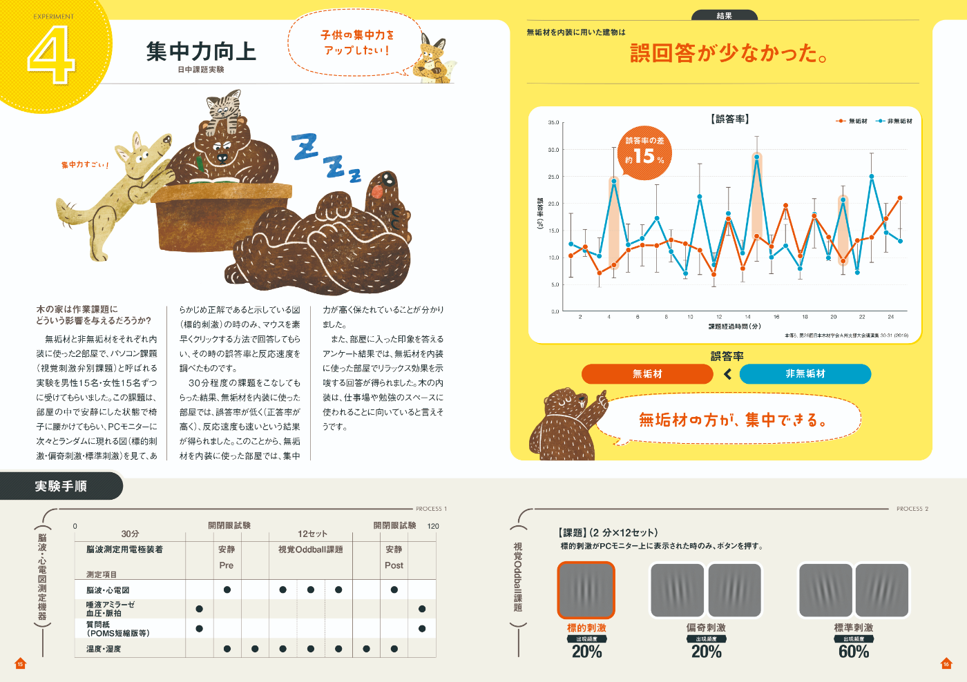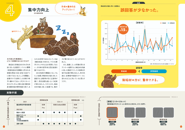 30分程度の課題をこなしてもらった結果、無垢材を内装に使った部屋では、誤答率が低く(正答率が高く)、反応速度も速いという結果が得られました。このことから、無垢材を内装に使った部屋では、集中力が高く保たれていることが分かりました。