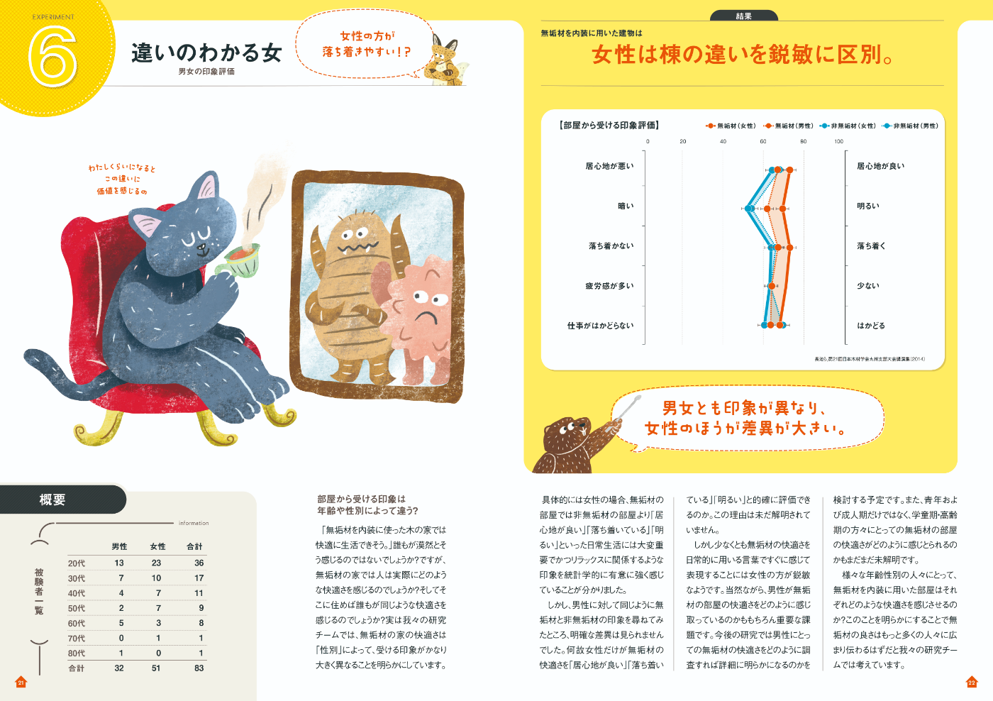 様々な年齢性別の人々にとって、無垢材を内装に用いた部屋はそれぞれどのような快適さを感じさせるのか?このことを明らかにすることで無垢材の良さはもっと多くの人々に広まり伝わるはずだと研究チームでは考えています。