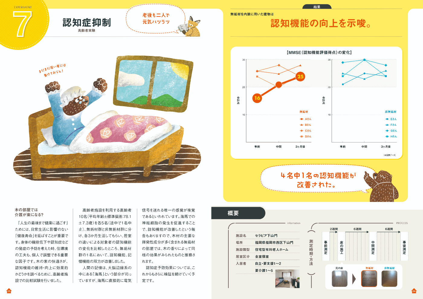 高齢者施設を利用する高齢者10名(平均年齢±標準偏差:78.1 ±7.3歳)を各5名(途中で1名中止)、無垢材群と非無垢材群に分け、各3か月生活してもらい、居室の違いによる対象者の認知機能の変化を比較したところ、無垢材群の1名において、認知機能、記憶機能の双方が改善しました。
