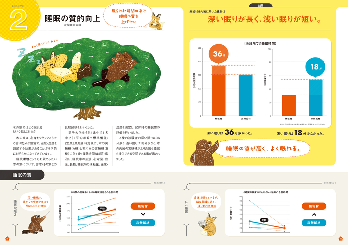 A棟の被験者の深い眠りは36分多く、浅い眠りは18分少なく、木の内装の実験棟がより良質な睡眠を提供できる空間である事が示されました。