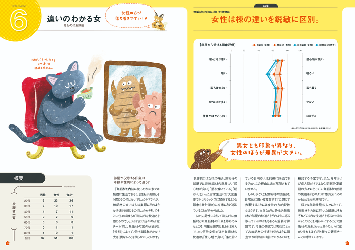 しかし少なくとも無垢材の快適さを日常的に用いる言葉ですぐに感じて表現することには女性の方が鋭敏なようです。当然ながら、男性が無垢材の部屋の快適さをどのように感じ取っているのかももちろん重要な課題です。今後の研究では男性にとっての無垢材の快適さをどのように調査すれば詳細に明らかになるのかを検討する予定です。