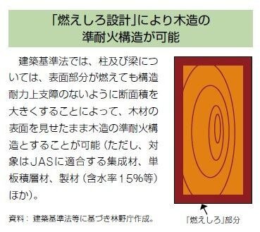 ただ、木は燃えたとして、イメージされているほどすぐに崩れ落ちるわけではありません。短時間であれば、木の表面は燃えていても、その中身は強度を保っているのです。これを生かした設計は「燃えしろ設計」などと呼ばれています。