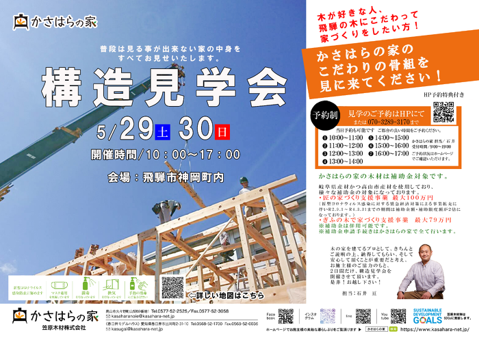 また、木の好きな方、木にこだわりを持って家づくりをして頂きたい方!ぜひ、かさはらの家のこだわりの骨組みを見に来て下さい!
