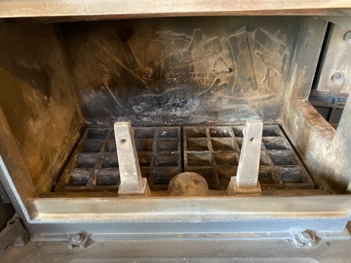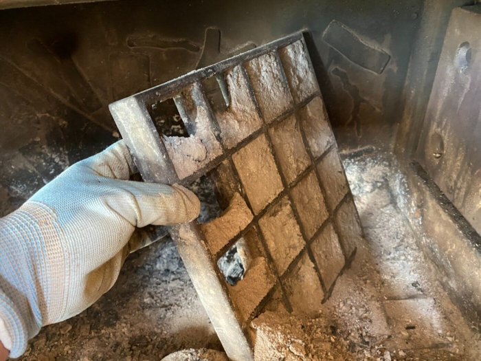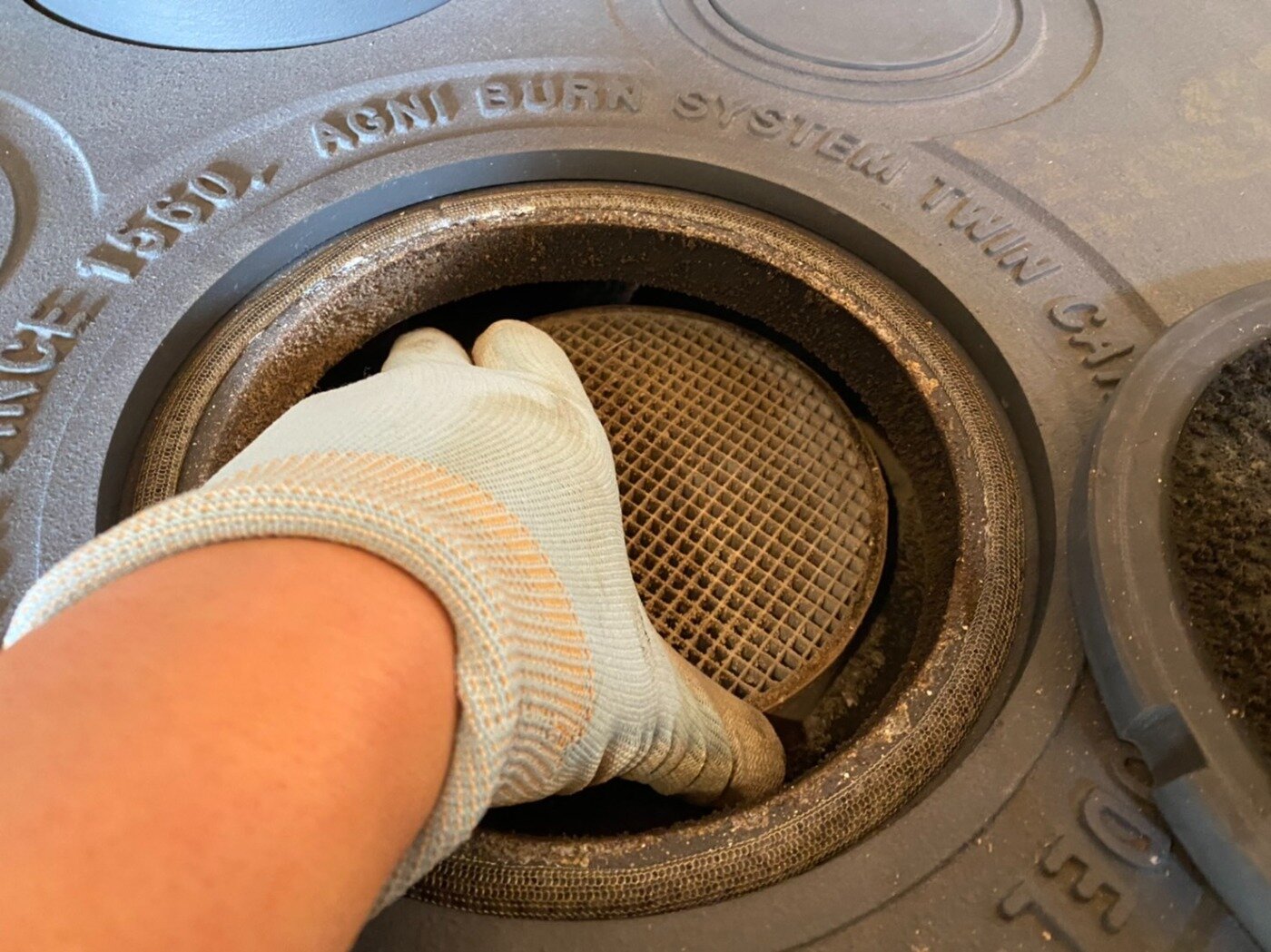 灰が出せたらグレーチング?のようなものを持ち上げて目に詰まっている灰を指で押して落とします。