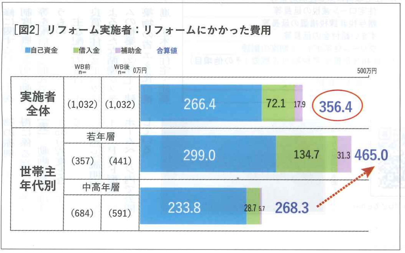 実施者がリフォームにかけた費用の平均は356万円「図2」で、検討時の予算の平均279万円を上回った。年代別にみると、中高年層(50代以上)は平均268万円であるのに対し、若年層(40代以下)は平均465万円と大きく上回った。