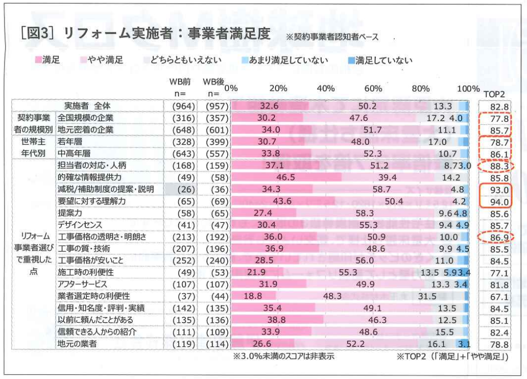 実施者の事業者に対する満足度は全体で82.8%「図3」。実施者が事業者選びで重視した点から読み解くと「要望に対してする理解力」94%、「減税や補助制度を提案・説明してくれる」93%、「担当者の対応・人柄」88.3%が高いことから、これらが満足度につながると推測できる。