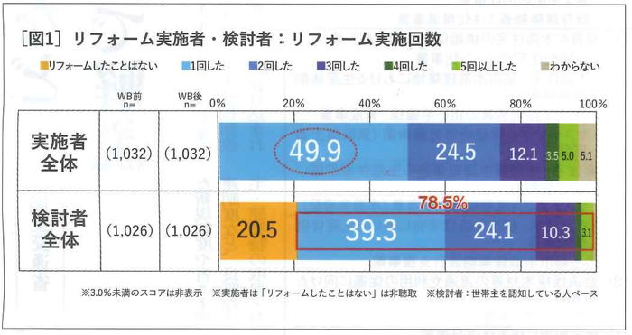 まず、リフォーム実施回数を聞いた「図1」。実施者の半数近くが2回以上リフォームを行っており、検討者でも2回以上となる人が78.5%だった。
