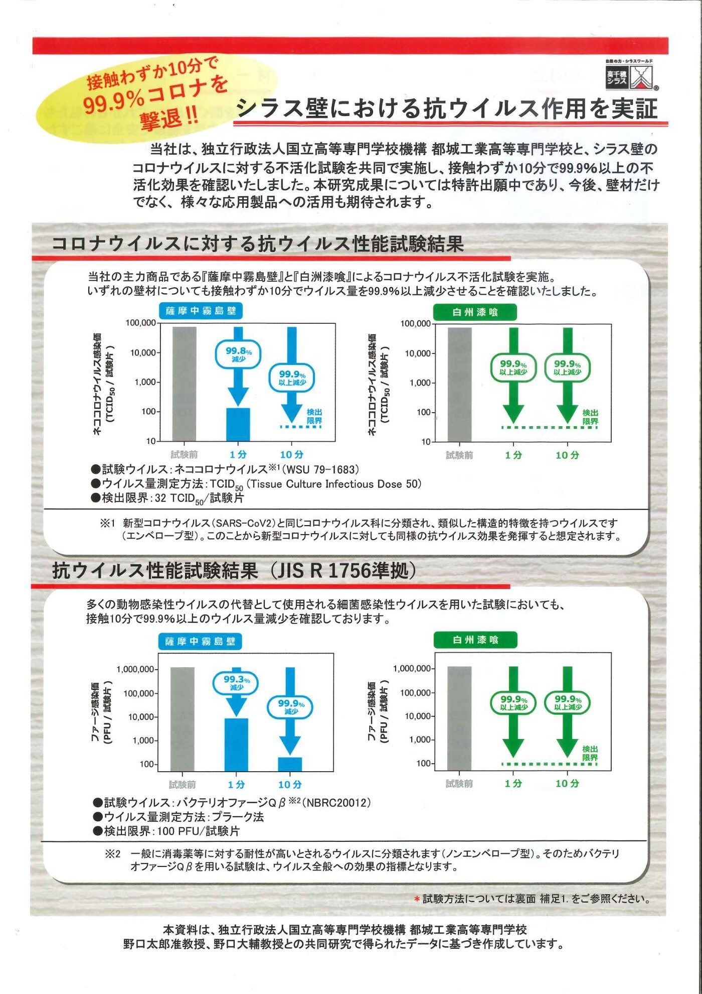詳細としては、「高千穂シラス株式会社は、独立行政法人国立高等専門学校機構 都城工業高等専門学校と、シラス壁のコロナウイルス※1に対する不活化試験を共同で実施し、接触わずか10分で99.9%以上の不活化効果を確認致しました。」(一部抜粋)