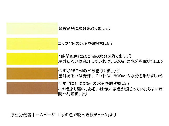 (水分補給は常に気を付けておくことが大切ですね。あまり尿の色に頼りすぎず体調の変化を感じたら自己判断ではなく早めに受診するなどの対処が必要です。まだまだ続く暑い夏、予防を心掛けながら夏を楽しみましょう。)