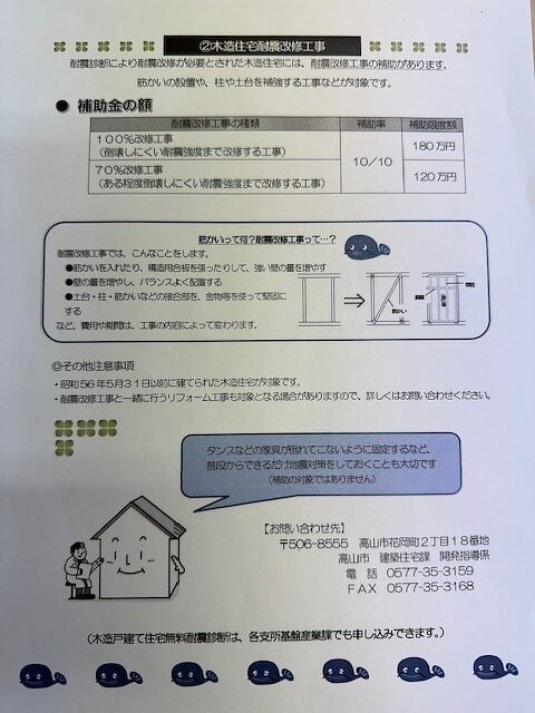 建物崩壊による被害を防ぐため高山市では木造住宅の耐震診断と耐震改修工事への補助を行っています。