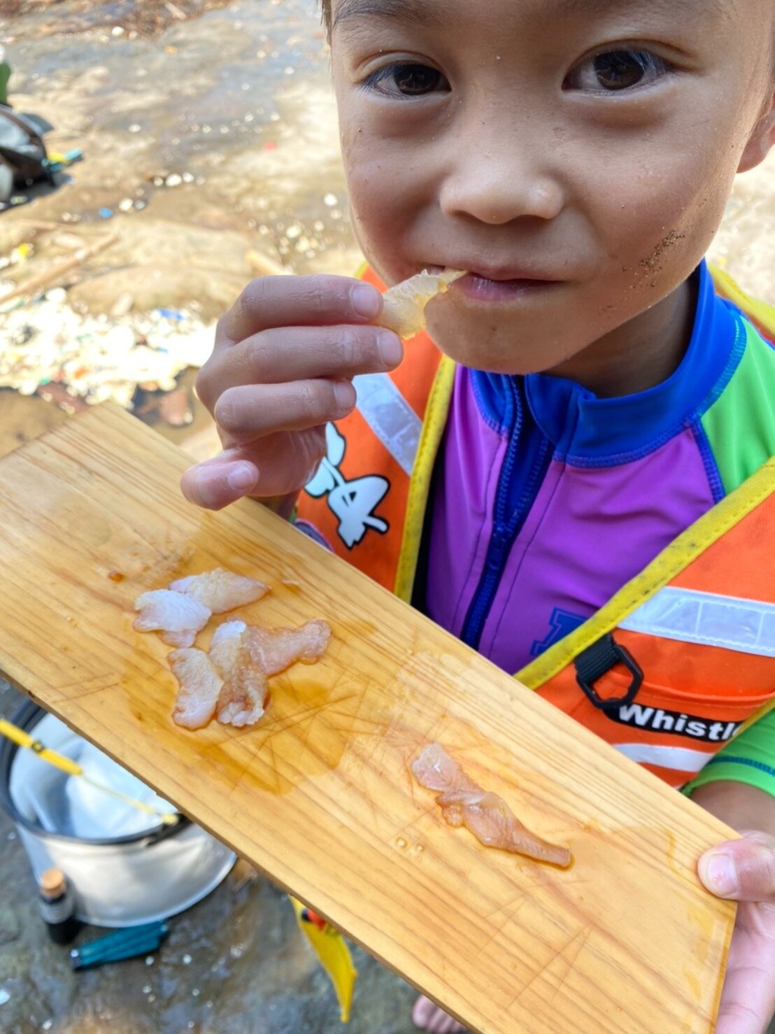 岩盤の間から山水が流れ出ている所が何ヵ所かあるので、そこで捌く。間違っても、海の家入り口にある足洗い場で捌いてはいけない。