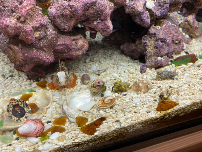 水槽の仲間入りしたヤドカリとシーグラス。