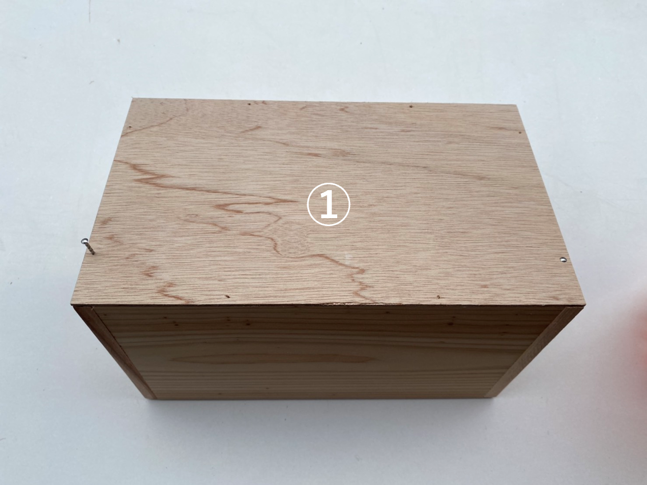 箱を裏返して、①薄い板(底板用)を釘で止めます。