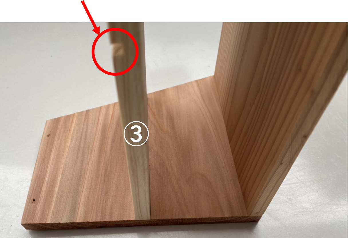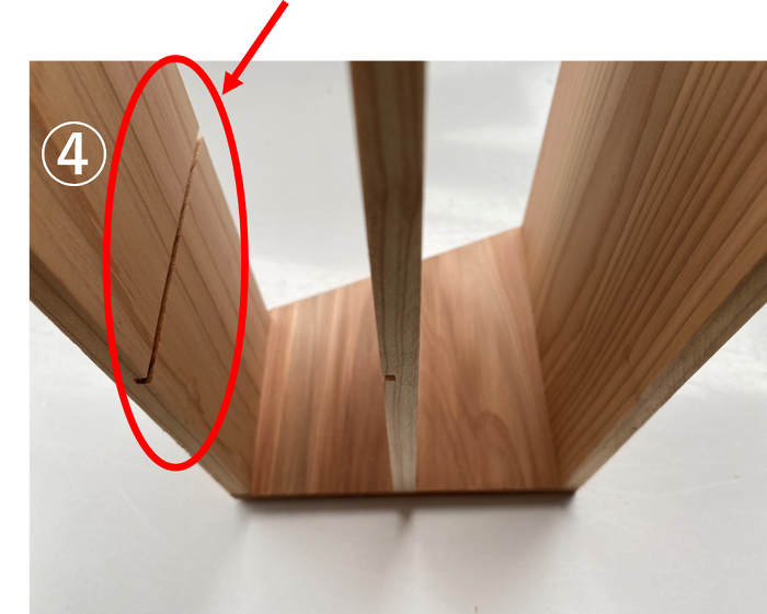 ※この時に写真のように溝の向きに注意してください。次に作る④の材料と溝が合うようにします。