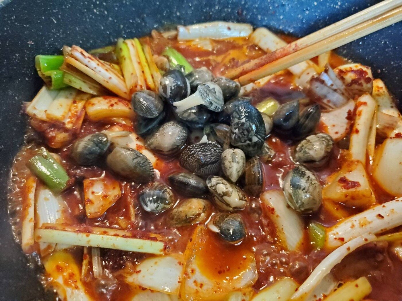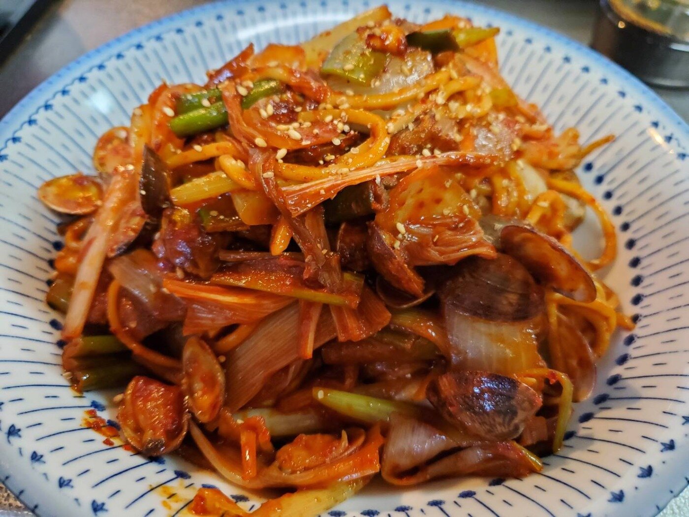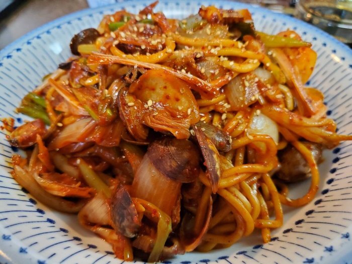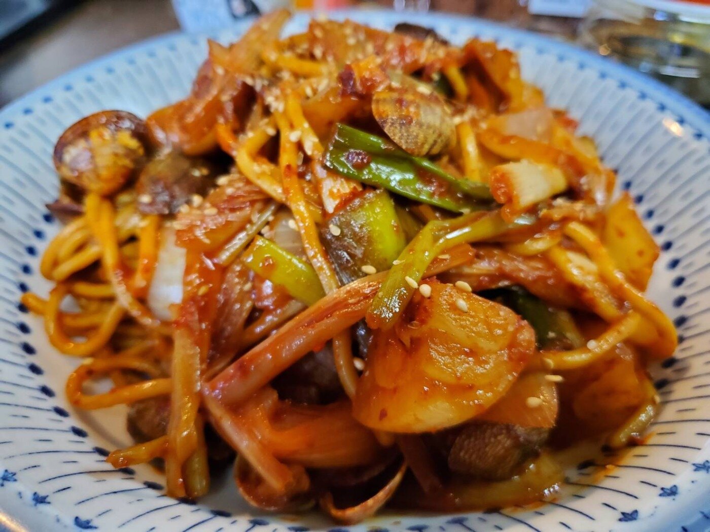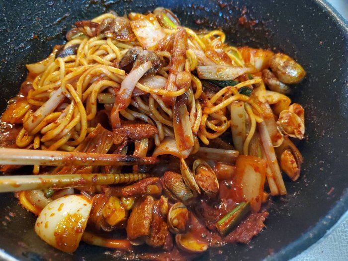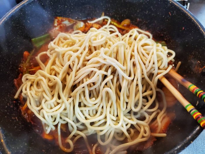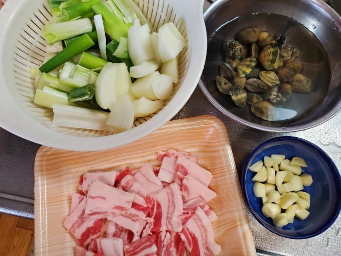 強火のまま野菜や唐辛子、水、あさり、焼きそば麺など順番にいれます。