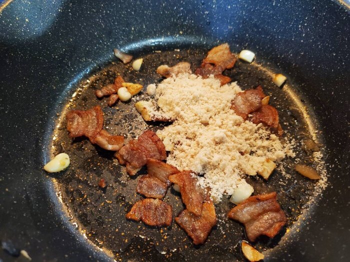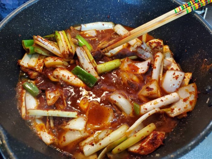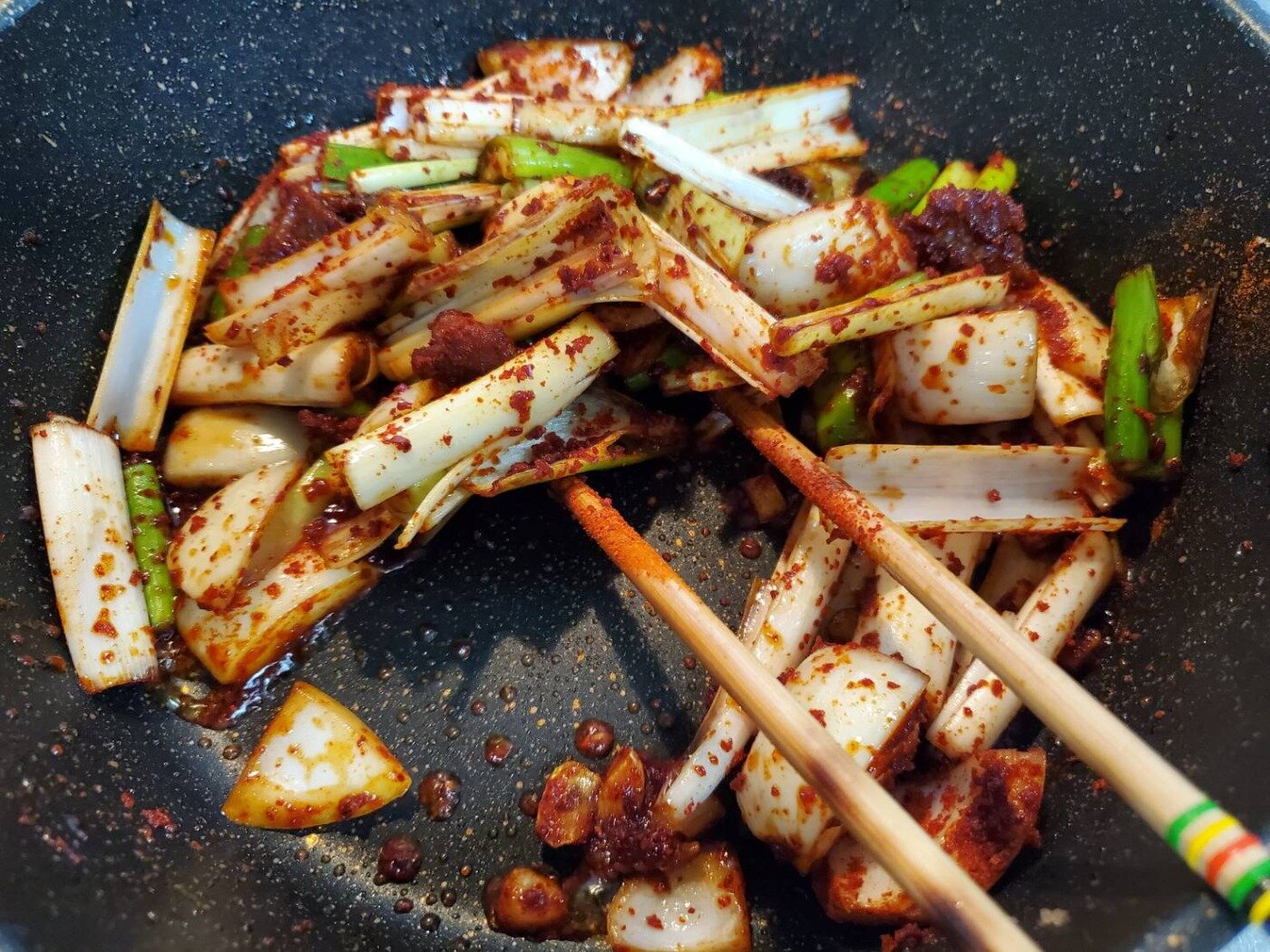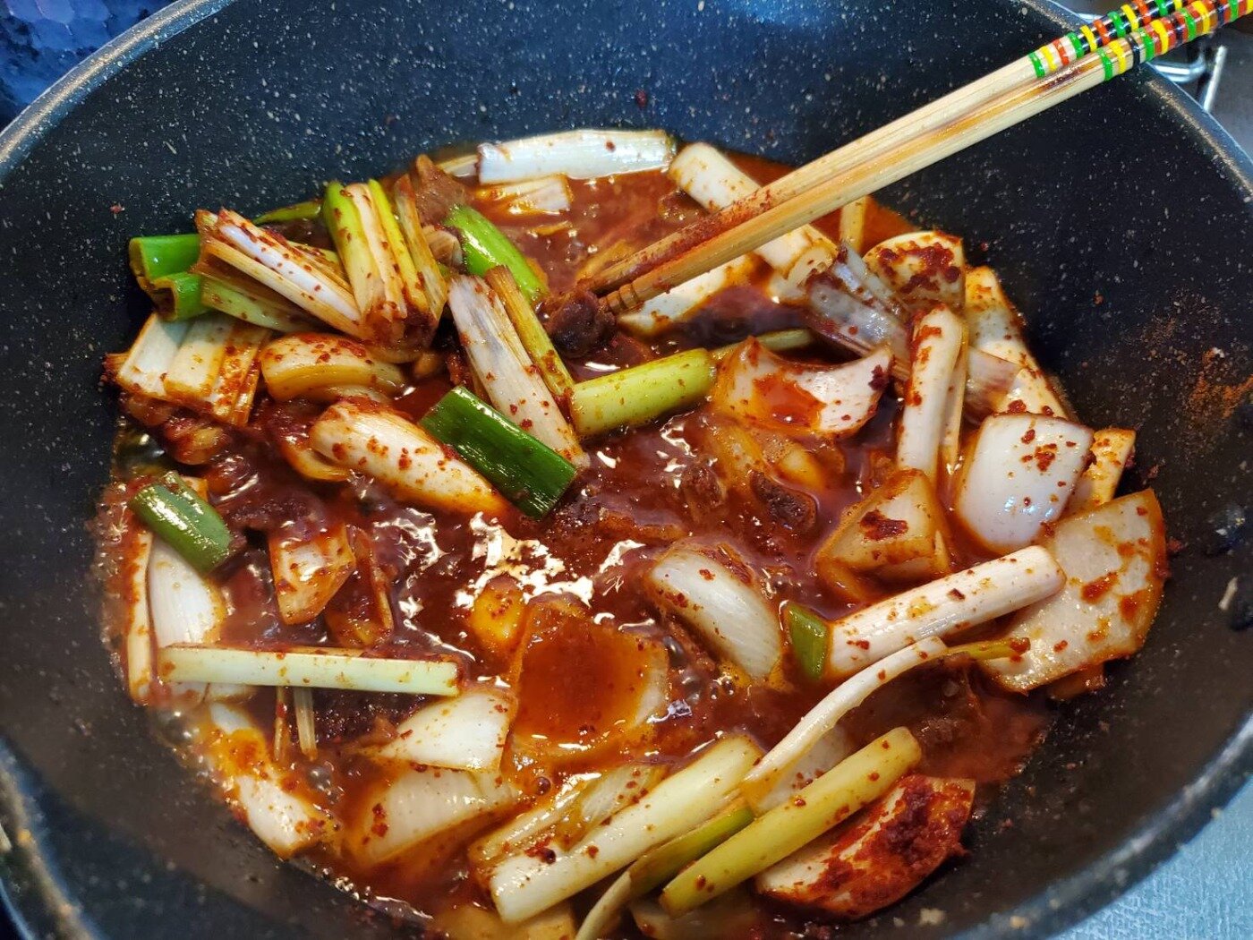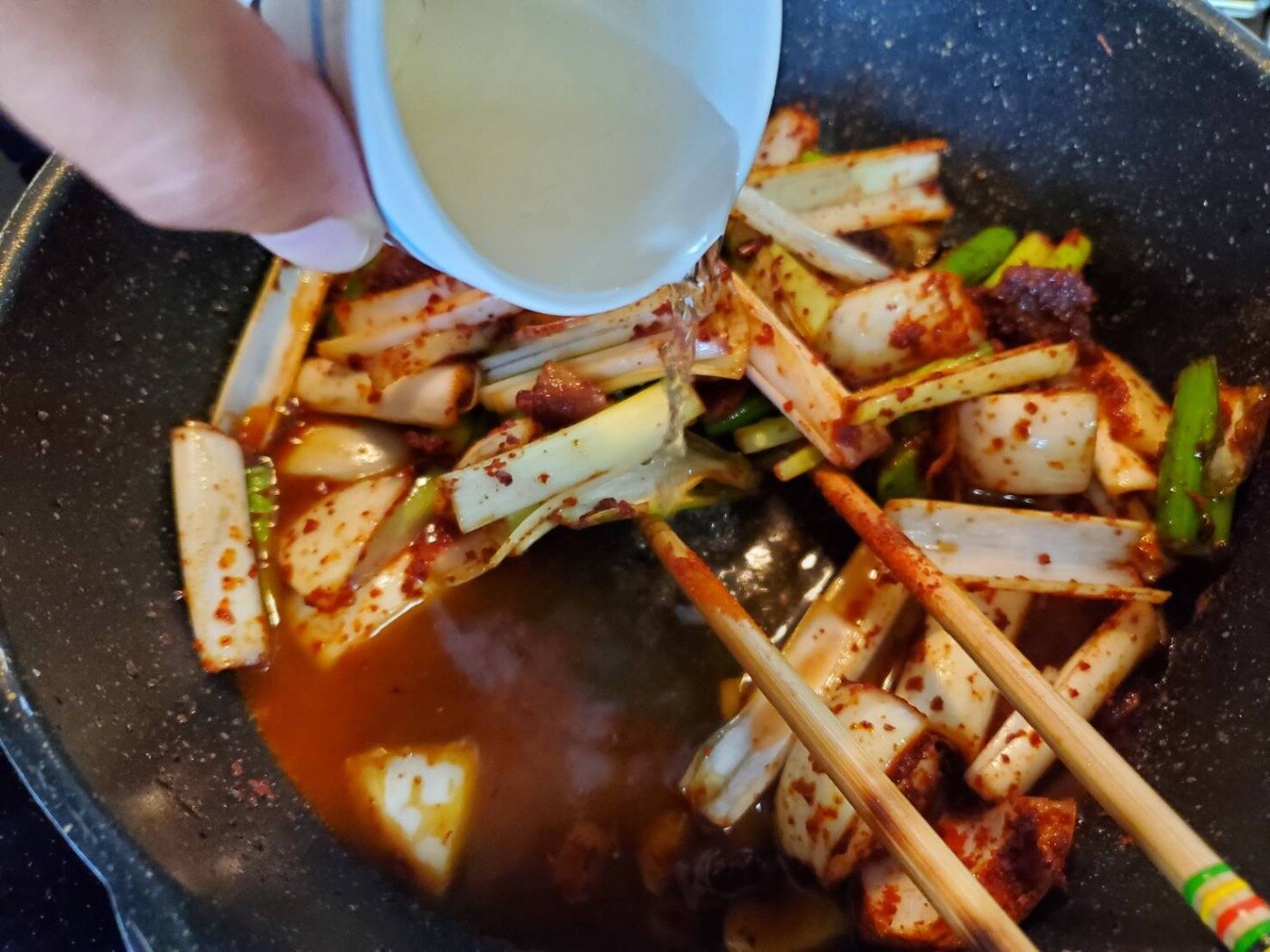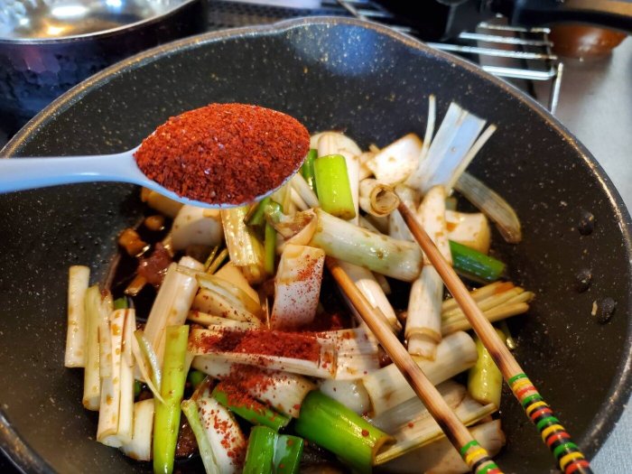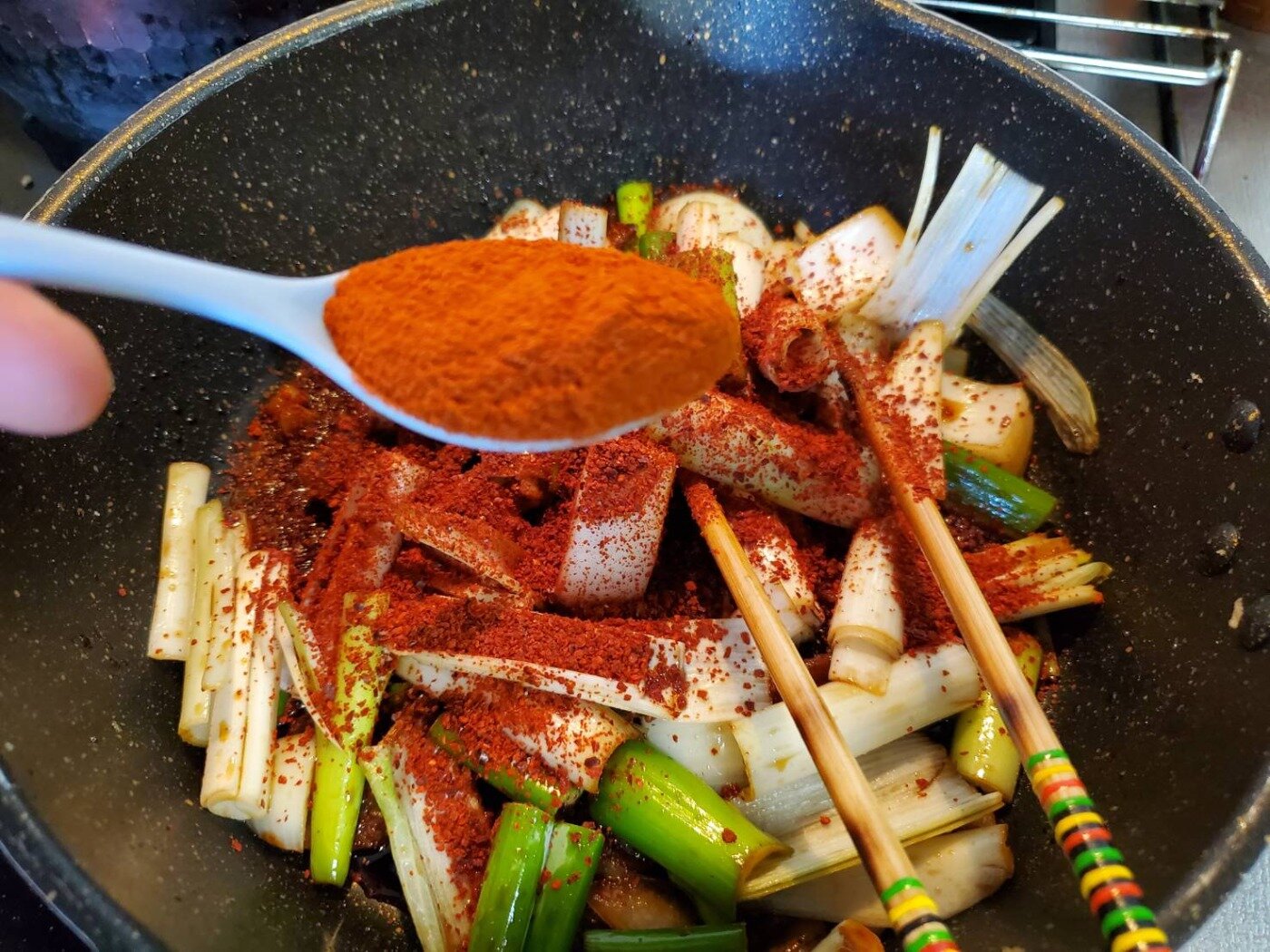 (これはどのくらい辛くするかによって入れる量は違うと思いますが、今回は唐辛子の粉(キムチ用)を2スプーン入れるつもりでしたのでその分入れました。)