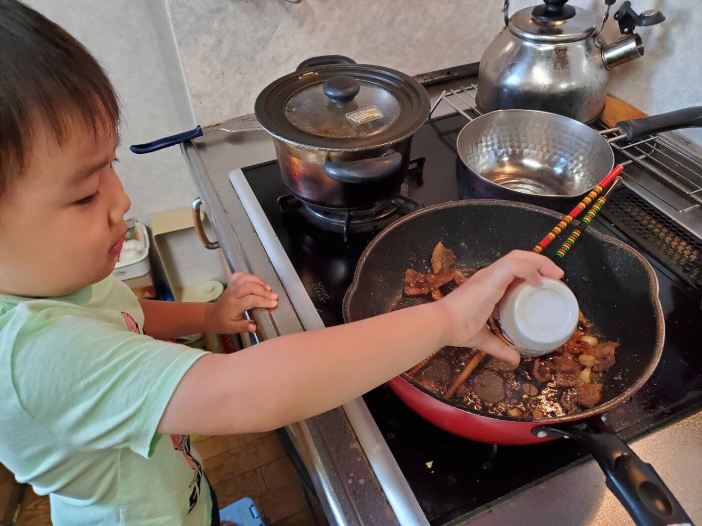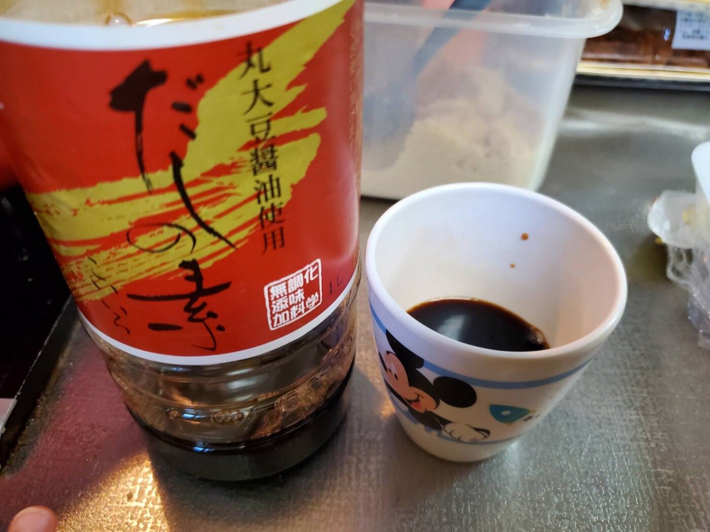 その後、醬油を写真のような量(子供用コップで1/4くらい入れました。)を入れます。