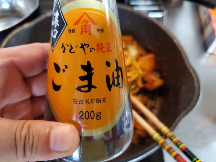 最後に火を止めて、ごま油(濃口)1スプーンを入れて、お皿に盛り、その上にゴマを振りかけたら出来上がりです。