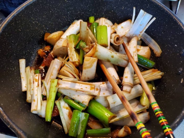 ネギは3~5㎝くらいに切ります。 青いところと白いところ全部使います。 火の通りをよくするため、縦にも切ります。