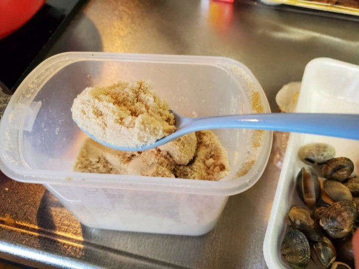 あさりは1パックの半分を使います。(以前作った時は入れなかったですが、何だか入れたらスパゲッティ風になるのではと思い入れることにしましたが、これがまた大正解でした!)