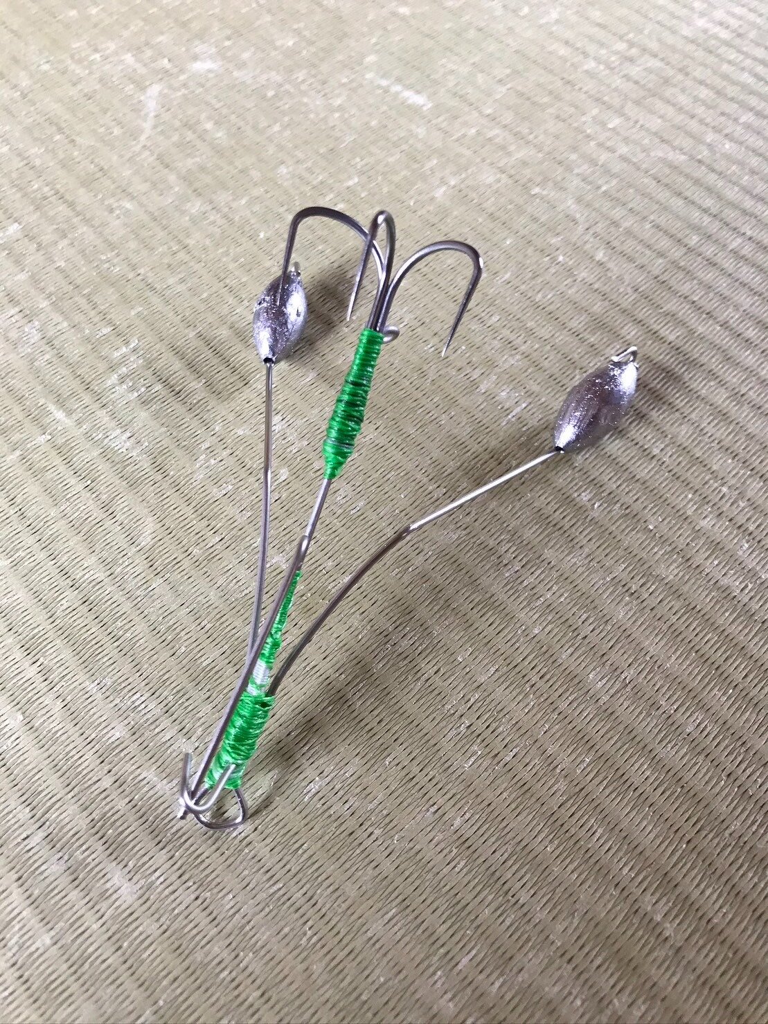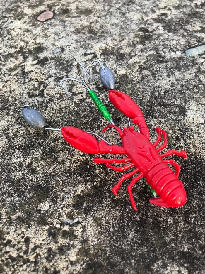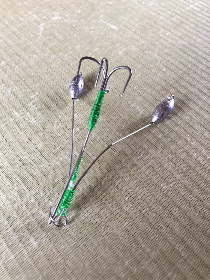 仕掛けはステンレスワイヤーを折り曲げて自作したものに、カニやザリガニを模したマテリアルを付けて海底をちょんちょんしていると掛かってきます!