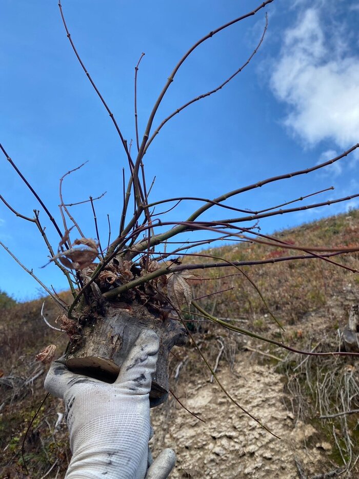 枝ぶりが良く、採れそうな株を見つけたら、バールで周りの土を掘り起こし、剪定ノコというギザギザの強いノコギリで、一心不乱に切る!!!大物はかなり疲れます。