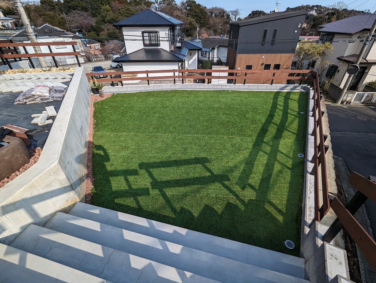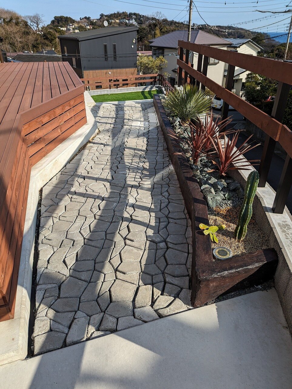 玄関廻りのロックガーデン、デッキ横のアプローチと花壇や人工芝など、