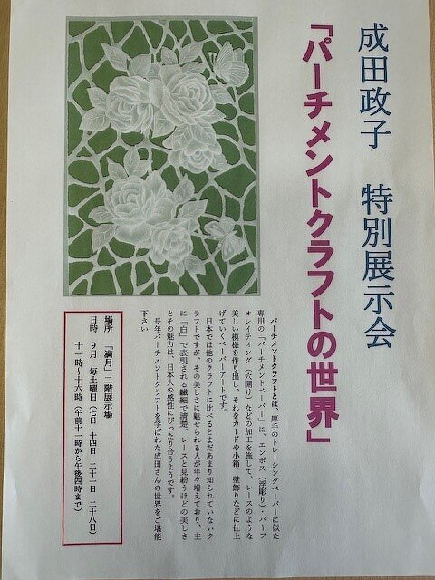 また別室では9月7日、14日、21日、28日の土曜日に成田政子さんの「パーチメントクラフトの世界」という特別展示会が開催されるそうです。皆さんはパーチメントクラフトってご存知ですか?私は全く知りませんでした・・・