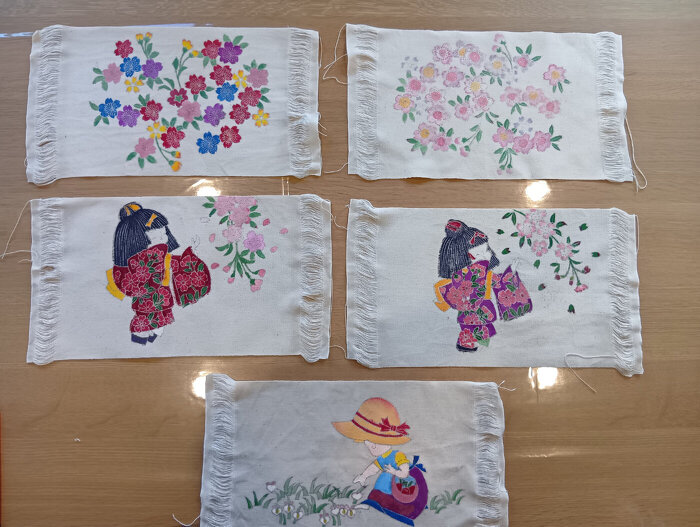 今回は事前に講師により描かれた下絵にそれぞれが着色し、アイロンをかけ色を定着。その後水につけ下絵ののりを洗い流し再度アイロンをかけて仕上げる技法。下絵を講師が描いてきてくだっさったので時間内で何とか完成しましたが、やはり伝統工芸 実に奥が深いものです。