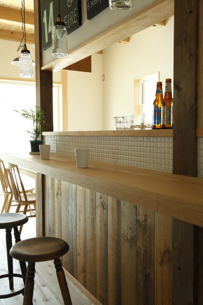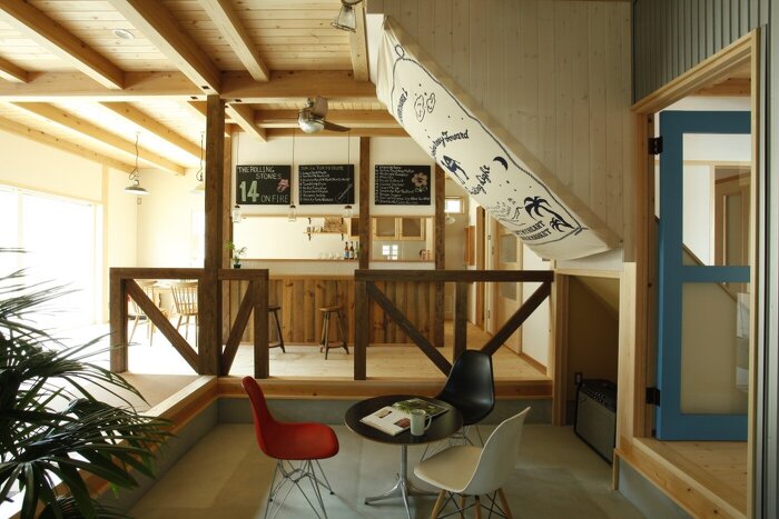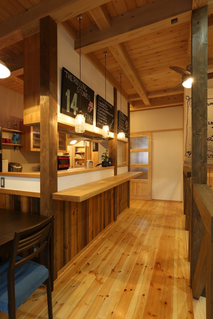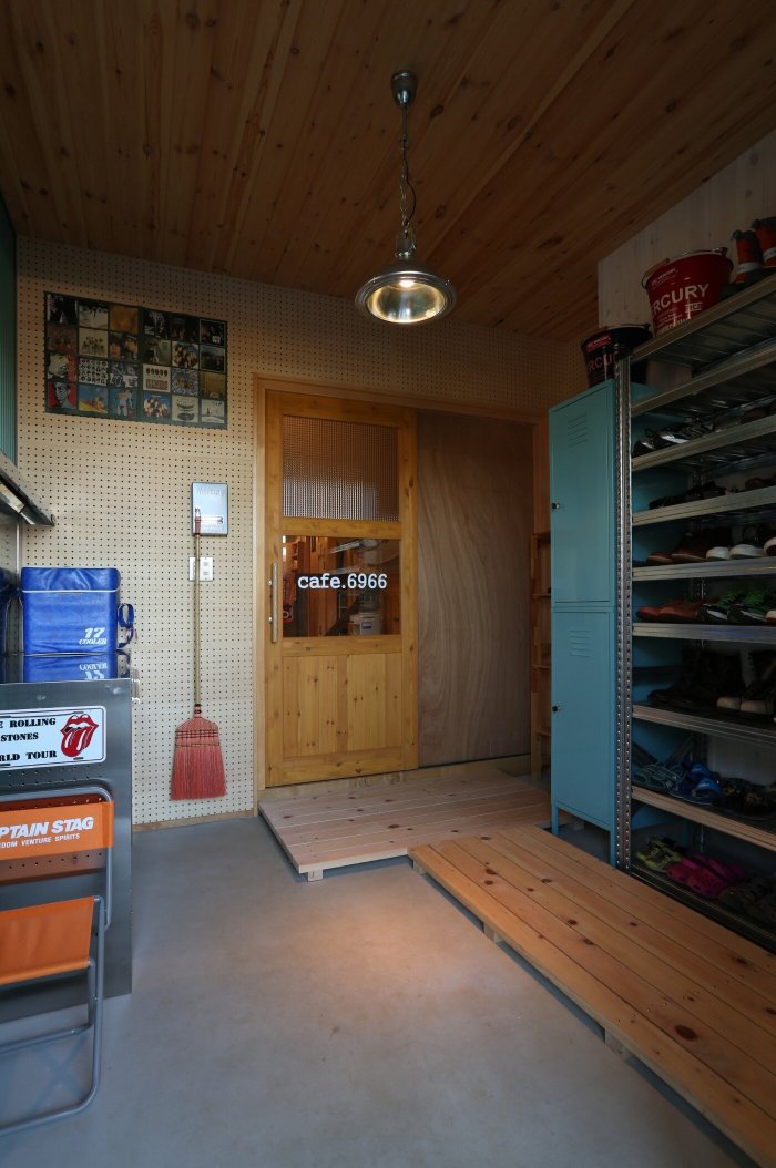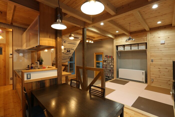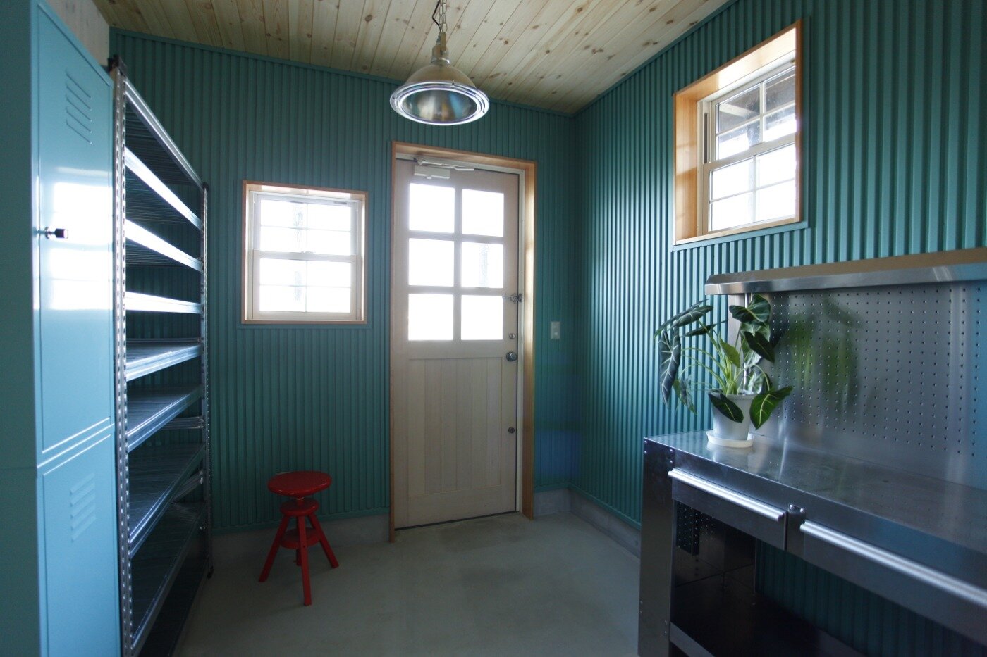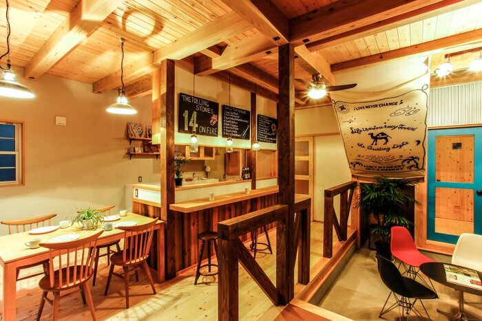 ガルバリウムを壁に貼った土間スペースからつながるダイニングは、まさにカフェなお家。