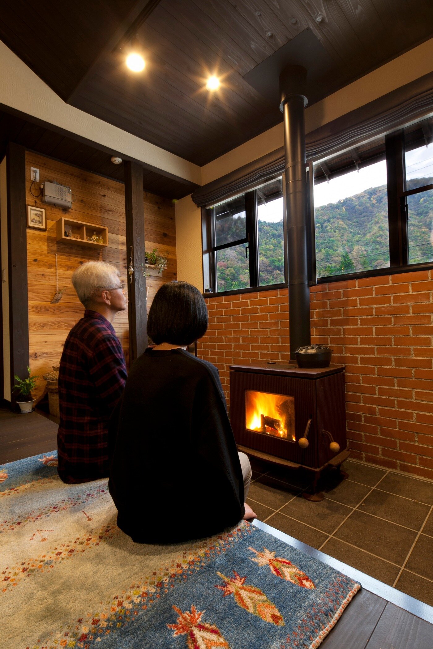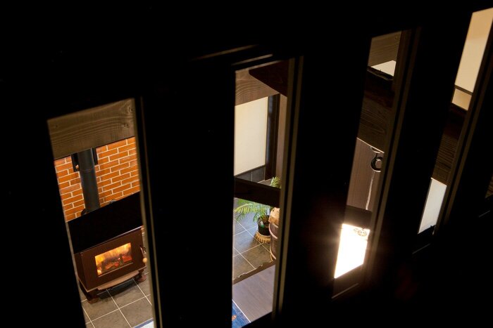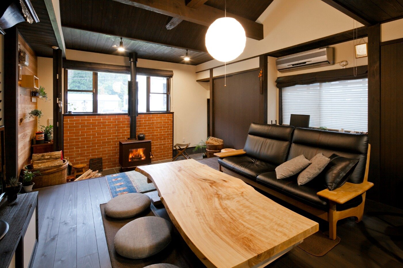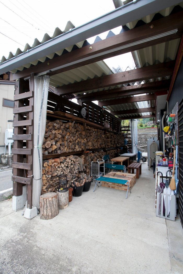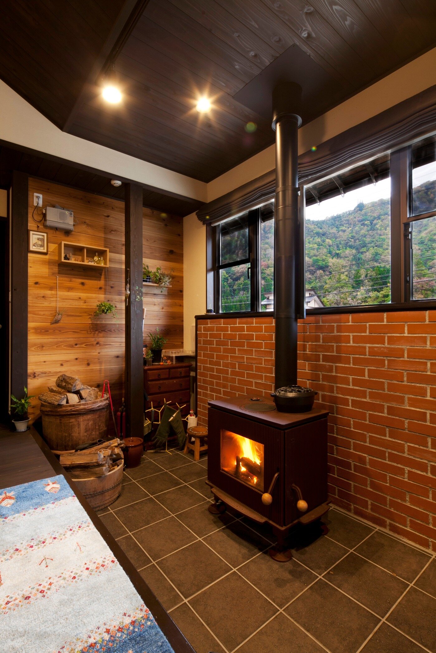 広い土間に薪ストーブ。