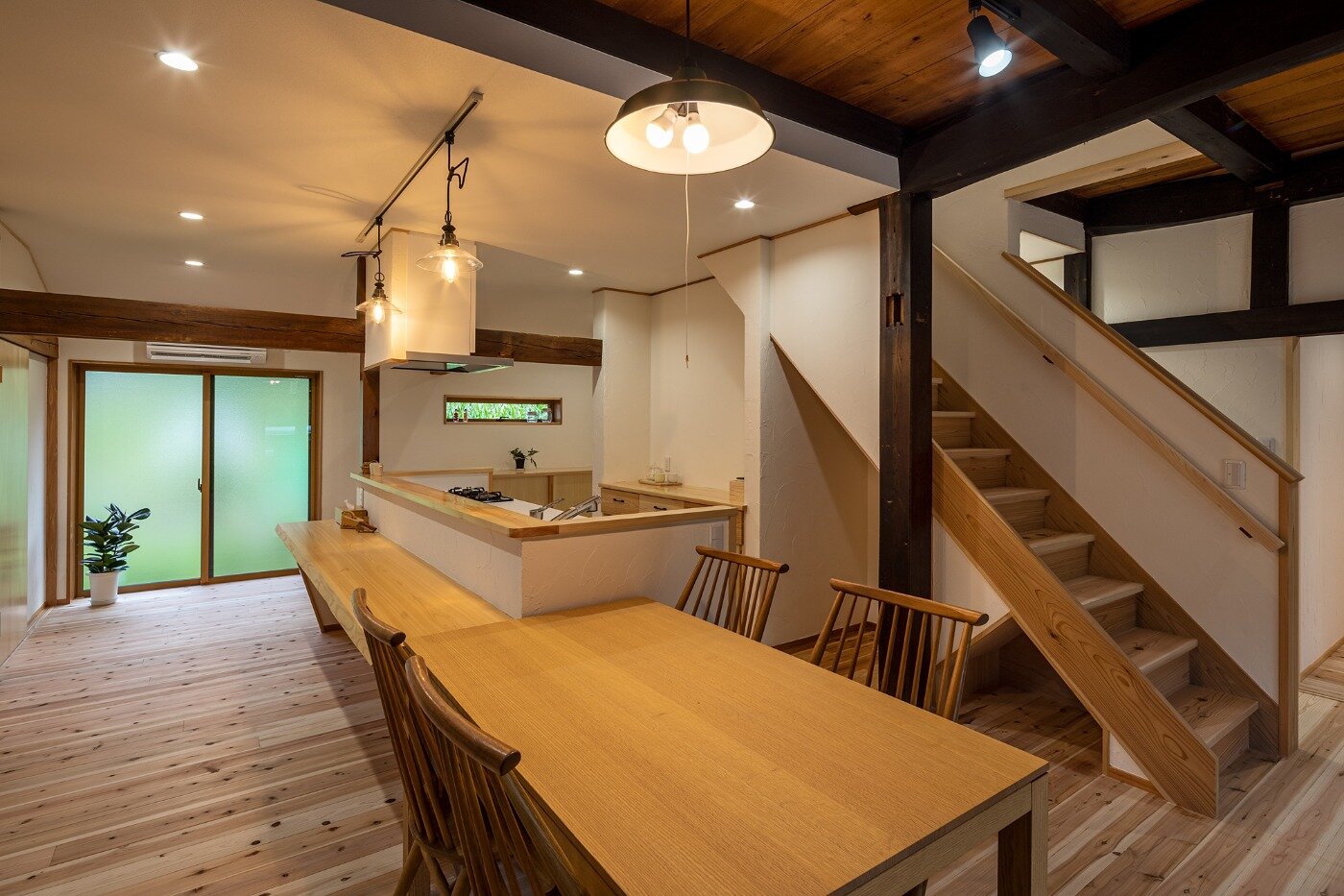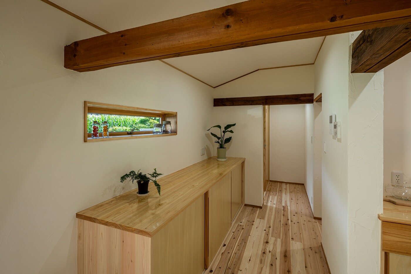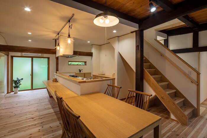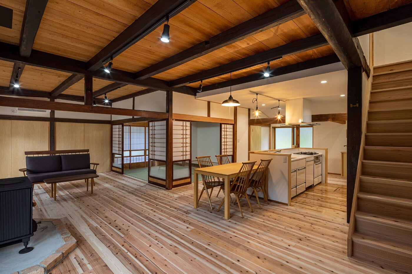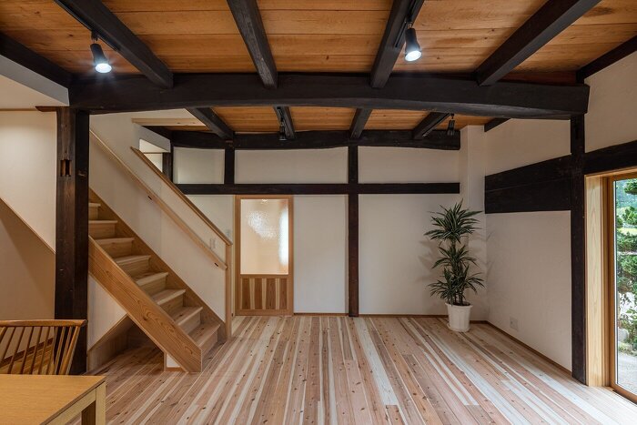 石の上に建っていたお家をジャッキアップして基礎をつくり、古材の梁を表しにして、壁は漆喰仕上げ。