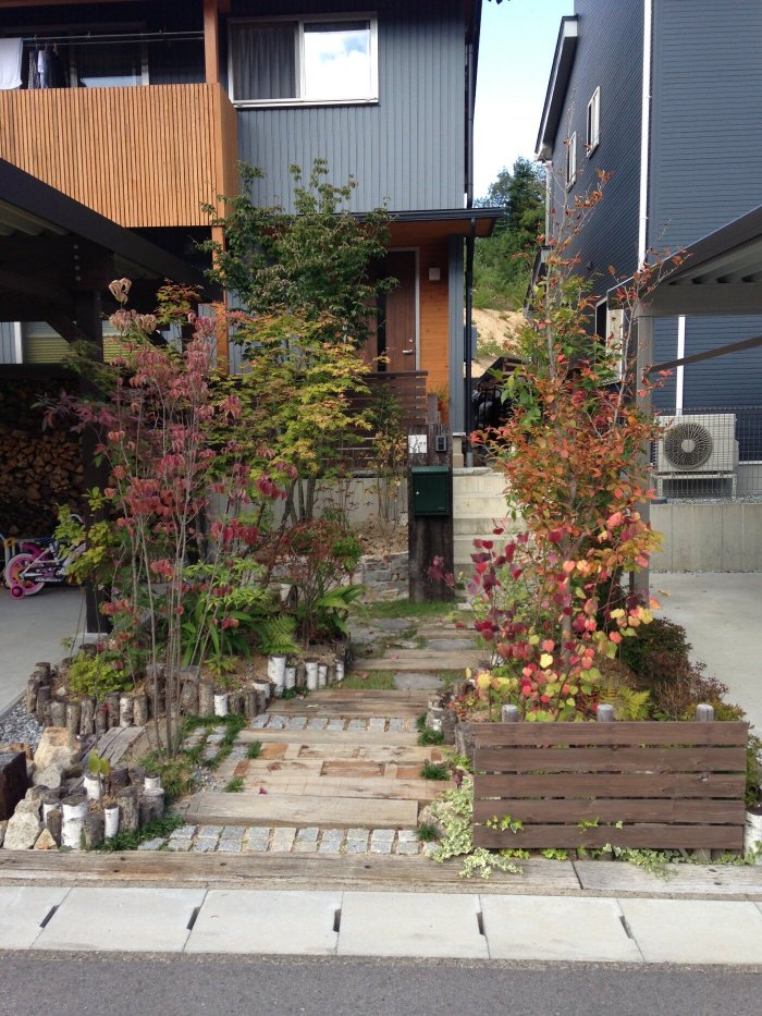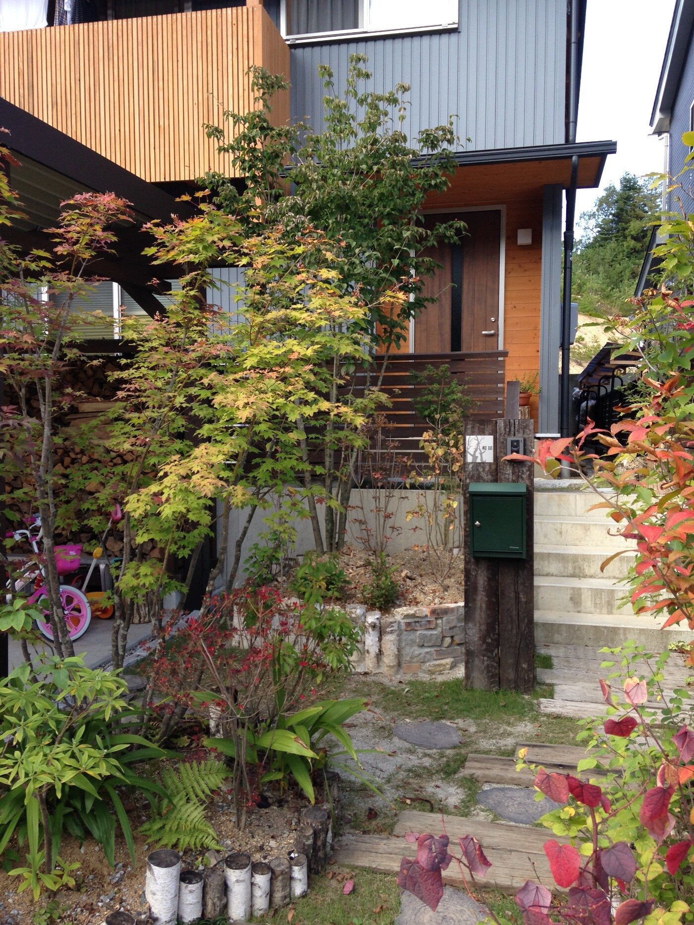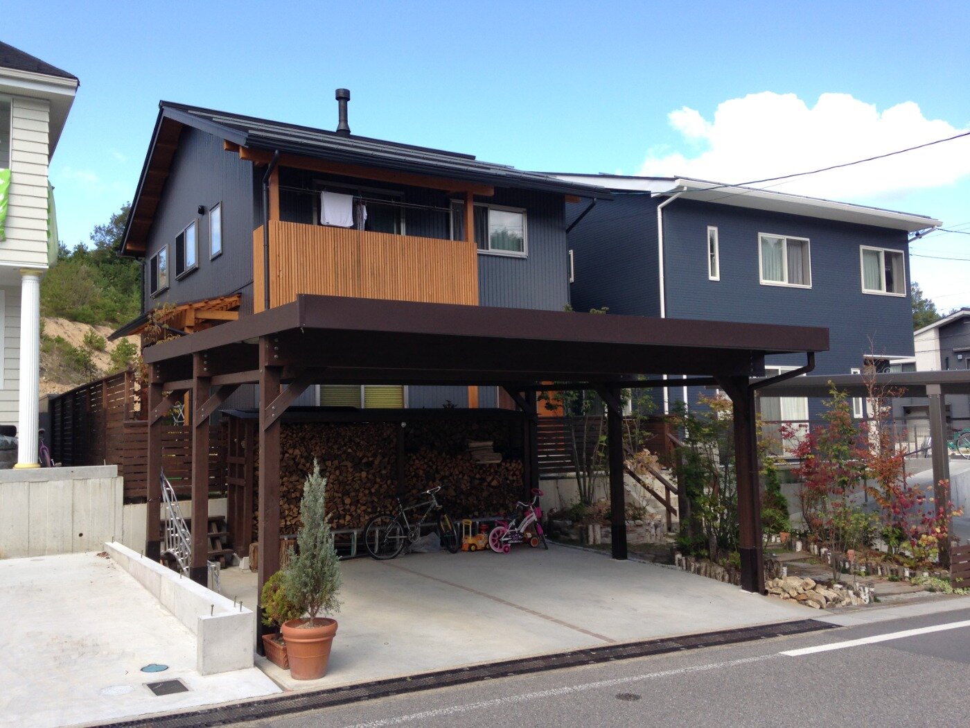 住宅地にある、木に囲まれた、薪ストーブのあるお家。