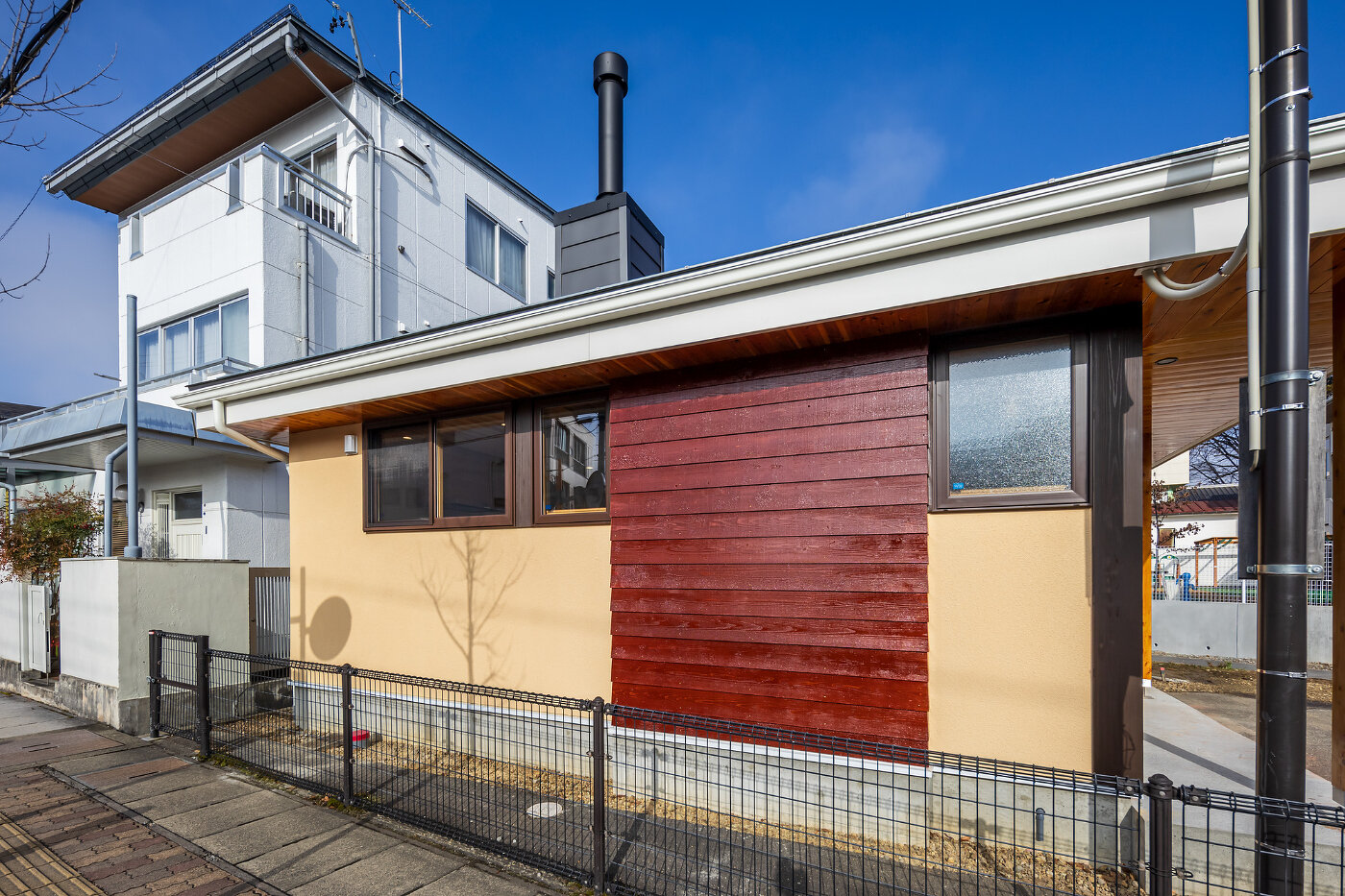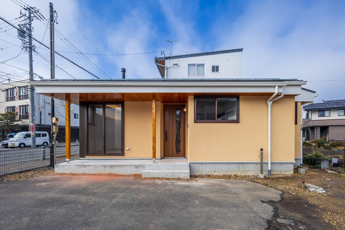 水平ラインを基調とした端正なフォルムに、無垢材のやわらかな質感を重ねた平屋の住まい。外観は静かに周囲の景色と溶け込みながらも、確かな存在感を放ちます。
